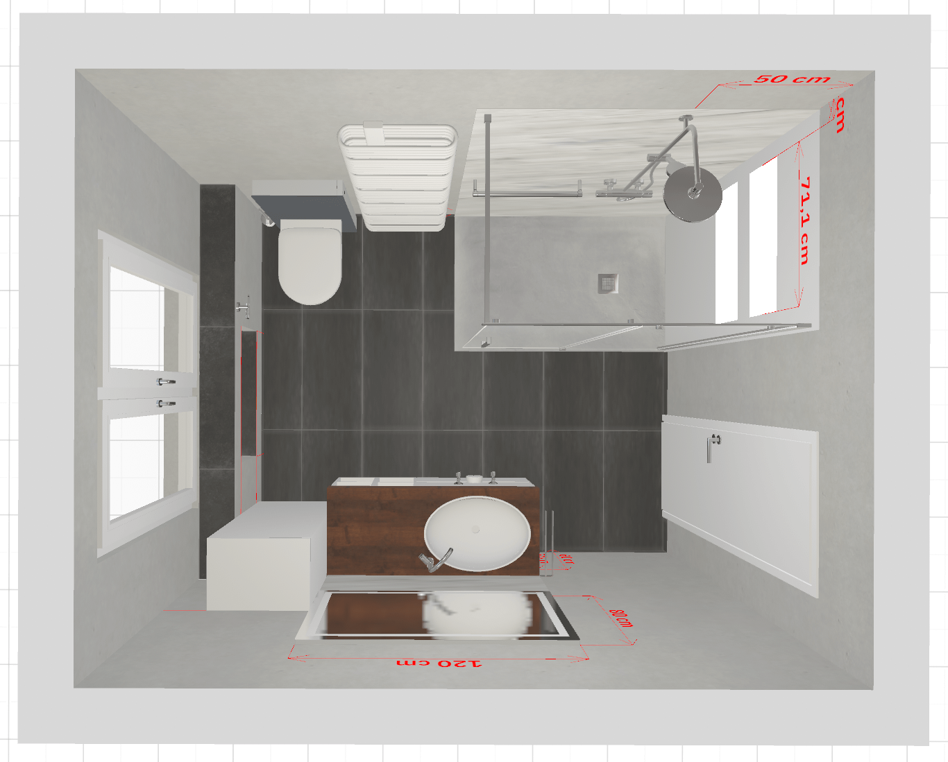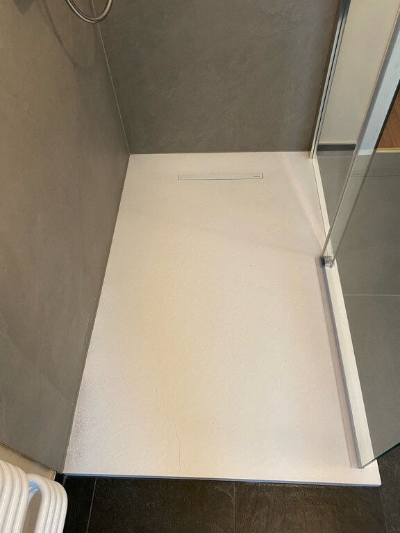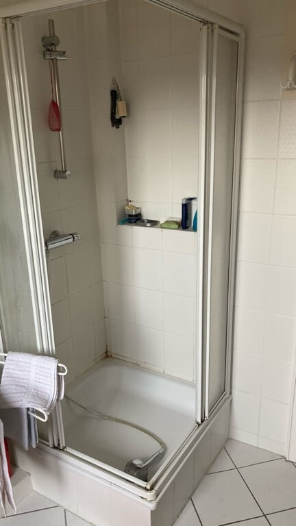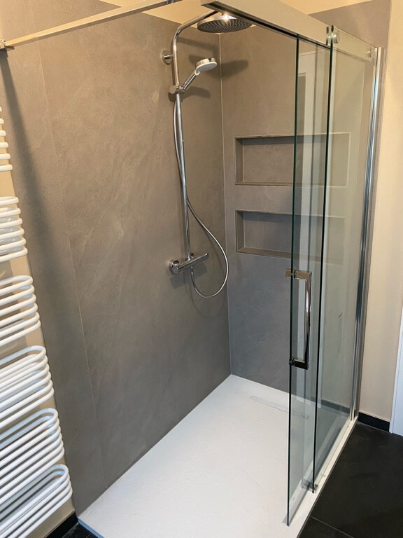 Der alte Wanneneinbau wurde vollständig entfernt und durch eine großzügige, bodengleiche Dusche ersetzt. Mit ihren edlen, großformatigen Wandfliesen in Betonoptik und der rahmenlosen Glaskabine schafft sie ein offenes, elegantes Raumgefühl. Die integrierten Ablagen in der Duschwand sorgen für praktische Ordnung und unterstreichen das klare Design.