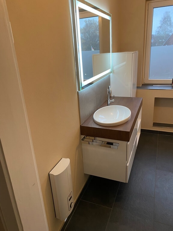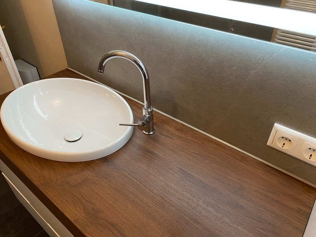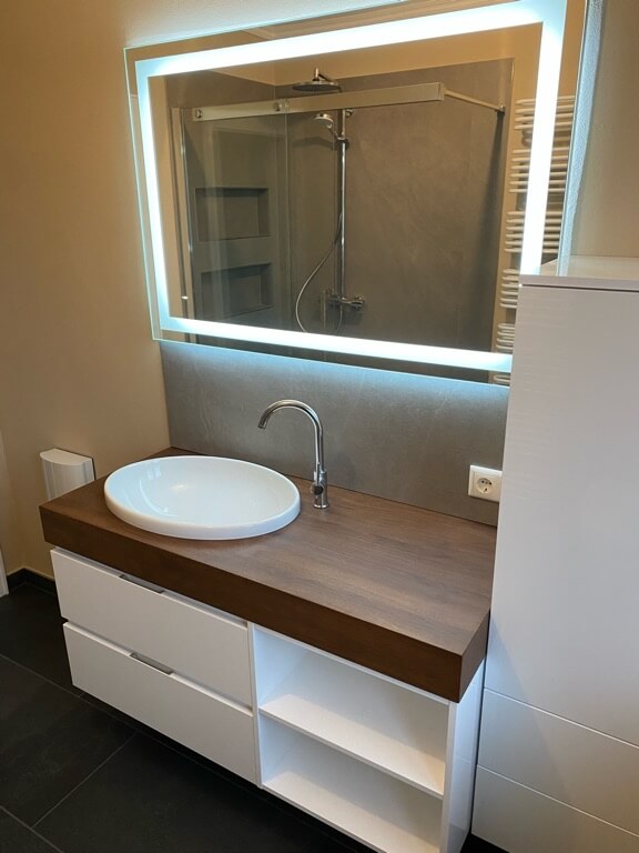 Der neue Waschtisch mit Aufsatzbecken kombiniert warmes Echtholzdekor mit puristischem Weiß und wird durch den beleuchteten LED-Spiegel perfekt in Szene gesetzt. Dezente Wandfarben und dunkle Bodenfliesen runden das harmonische Gesamtbild ab.