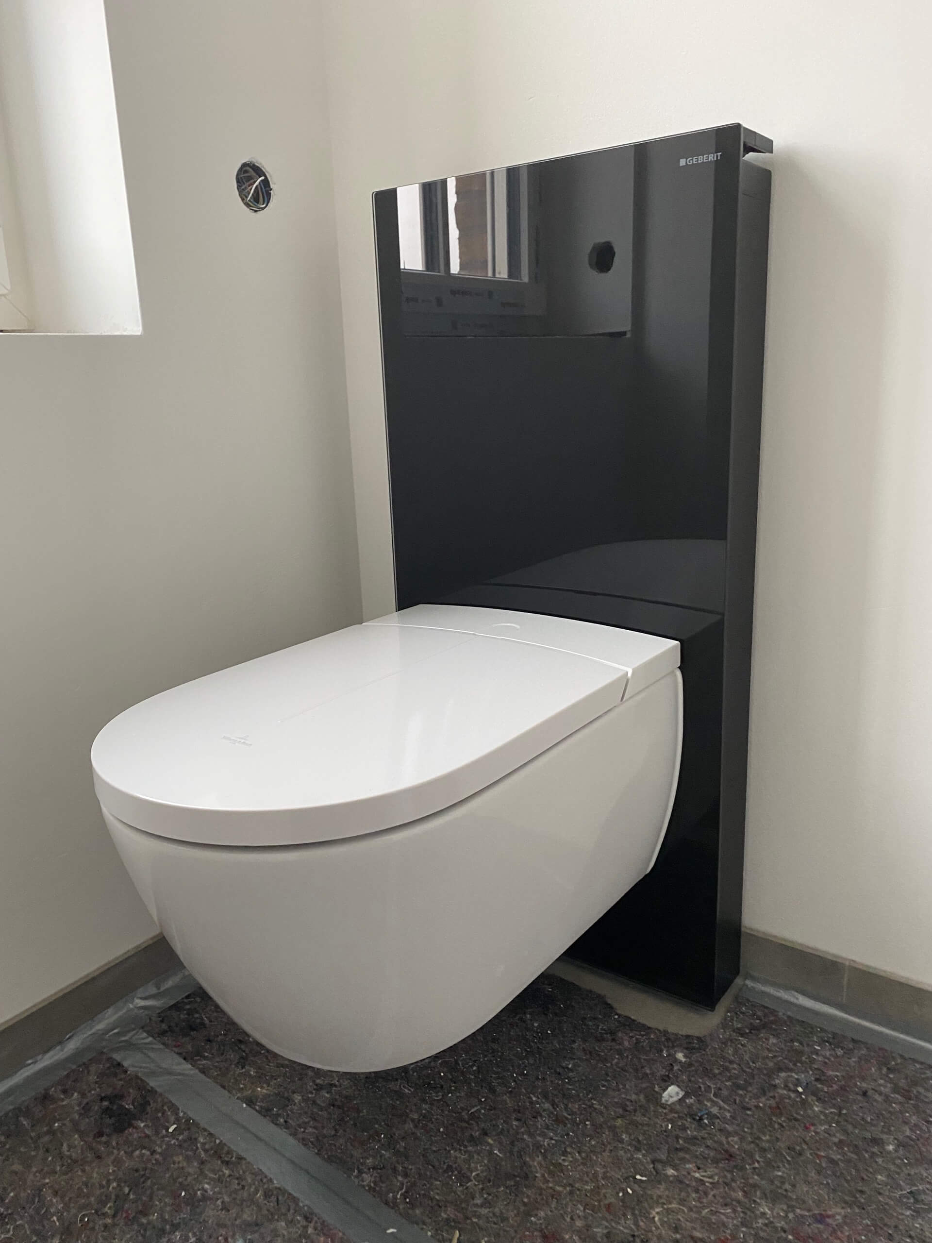 In diesem Neubauprojekt in Luhdorf wurde ein stilvolles Gäste-WC mit höchstem Anspruch an Design und Funktionalität realisiert. Das Highlight ist das Dusch-WC von Geberit, das mit seiner innovativen Technik und dem eleganten schwarzen Rückwandelement einen modernen Akzent setzt. Ergänzt wird das Ensemble durch einen freischwebenden Waschtisch aus massivem Eichenholz, kombiniert mit einer edlen Aufsatzschale von Villeroy & Boch und mattschwarzen Armaturen, die perfekt zum minimalistischen Stil passen.