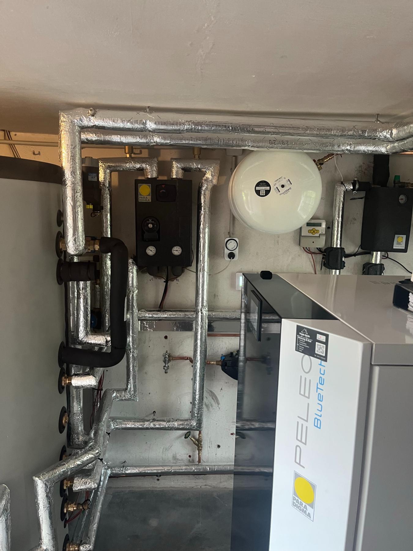 Die neue Paradigma PELEO BlueTech Pelletheizung überzeugt durch modernste Technologie, einen besonders hohen Wirkungsgrad und niedrige Emissionen. Im Zuge der Installation wurde die gesamte Heizungsanlage fachgerecht überarbeitet, Rohrleitungen wurden neu isoliert und die Hydraulik optimal auf das System abgestimmt. Das Ergebnis ist ein sauberer, technisch durchdachter Heizraum mit klarer Struktur und optimaler Energieausnutzung.