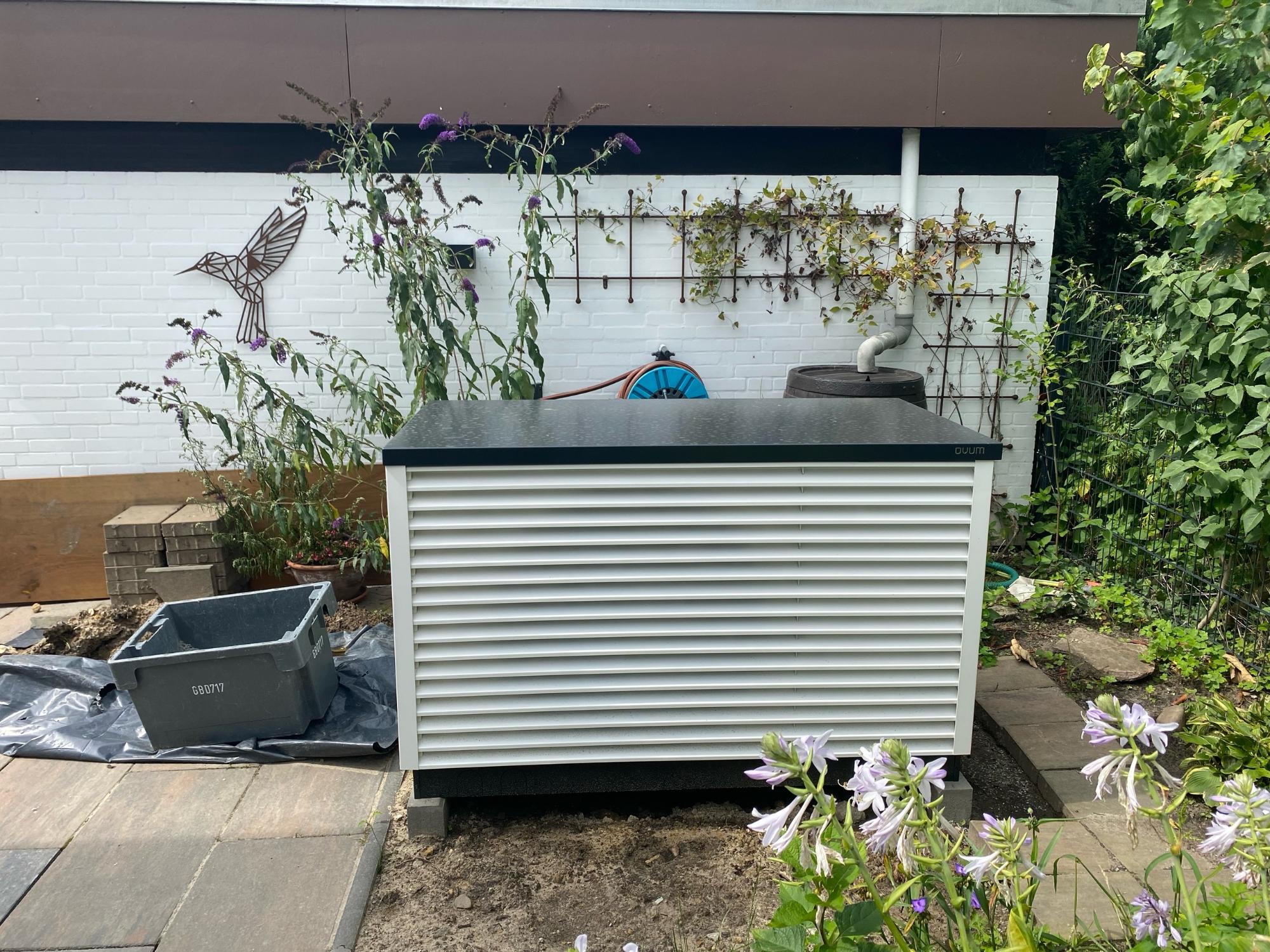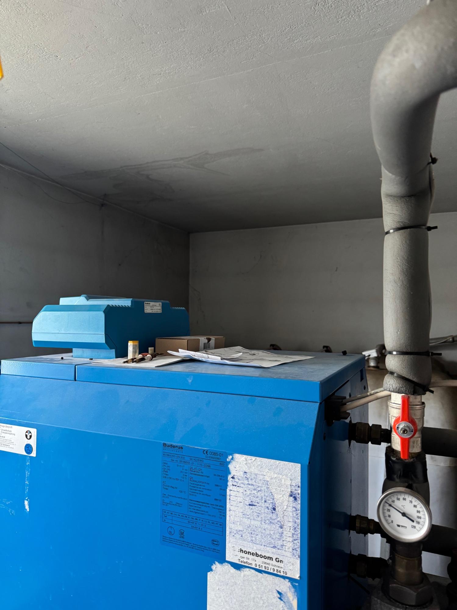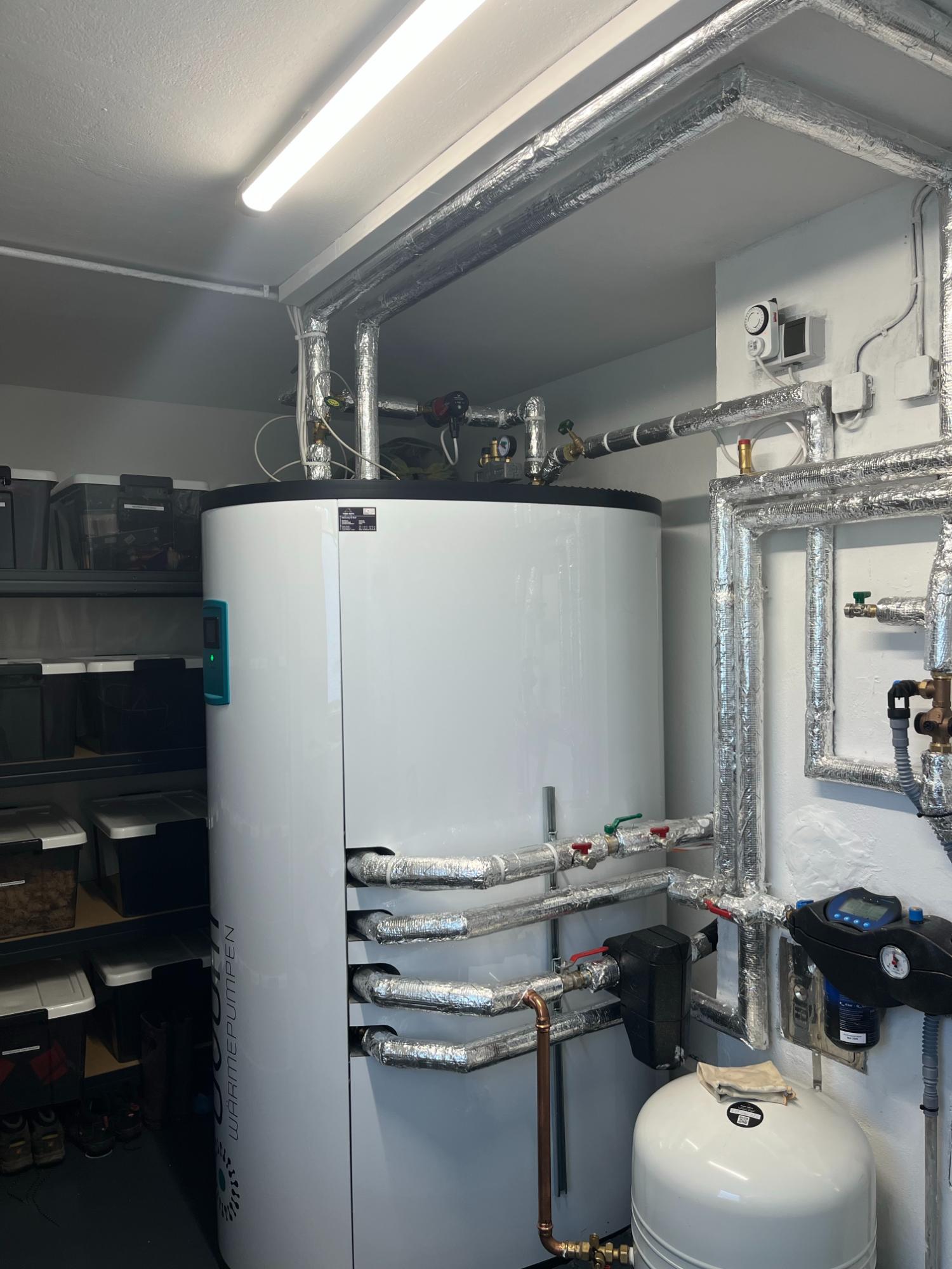 Im Rahmen der Umrüstung wurde die alte Ölheizanlage vollständig demontiert und durch ein modernes Wärmepumpensystem inklusive neuem Pufferspeicher und präzise gedämmter Rohrleitungen ersetzt. Die außen installierte Ovum-Wärmepumpe fügt sich dezent in den Gartenbereich ein und sorgt ganzjährig für nachhaltige Wärme und warmes Wasser.